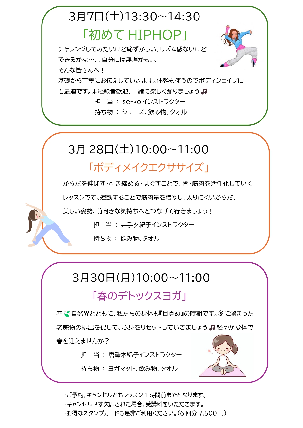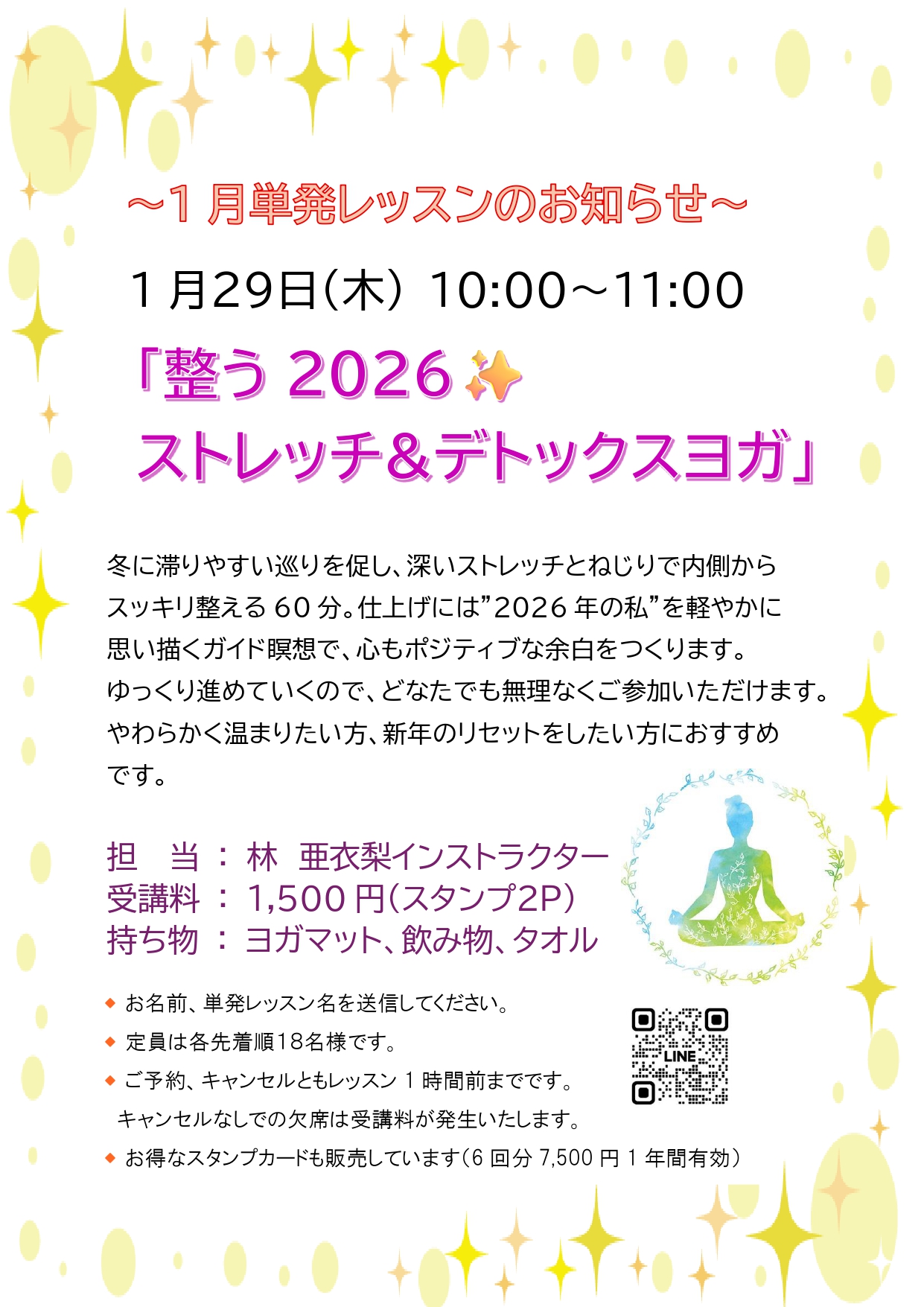 | 持ち物…飲み物、タオル、体験料、お持ちでしたらヨガマット(レンタルマットございます) 動きやすい服装で、レッスン開始15分前にお越しください。 |